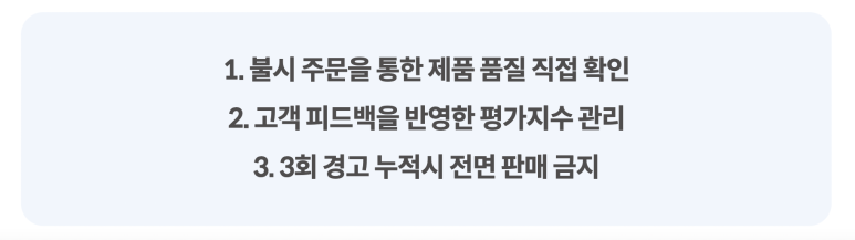 크래커 전직원은 미스테리 쇼퍼로서 월 2~3회 파트너들의 제품을 직접 구매하고 있습니다. 이 때 입점시 약속했던 검수 기준을 지키지 않는 것이 확인될 경우, 해당 파트너는 판매 제한 패널티를 받게 됩니다.